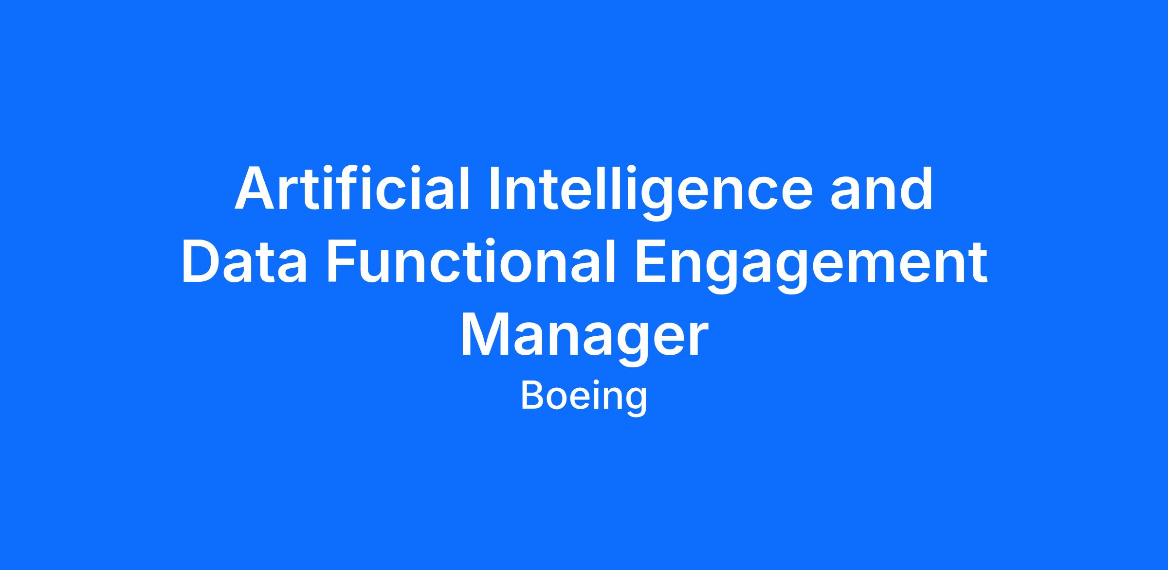 The Boeing CompanyThe Boeing Company is currently seeking an Artificial Intelligence and Data Functional Engagement Manager to join the team in Seattle, WA; Chicago, IL; Everett, WA; North Charleston, SC; Ridley Park, PA; Plano, TX; Pleasanton, CA; Renton, WA; Berkeley, MO; Mesa, AZ; Arlington, VA, El Segundo, CA or Long Beach, CA.